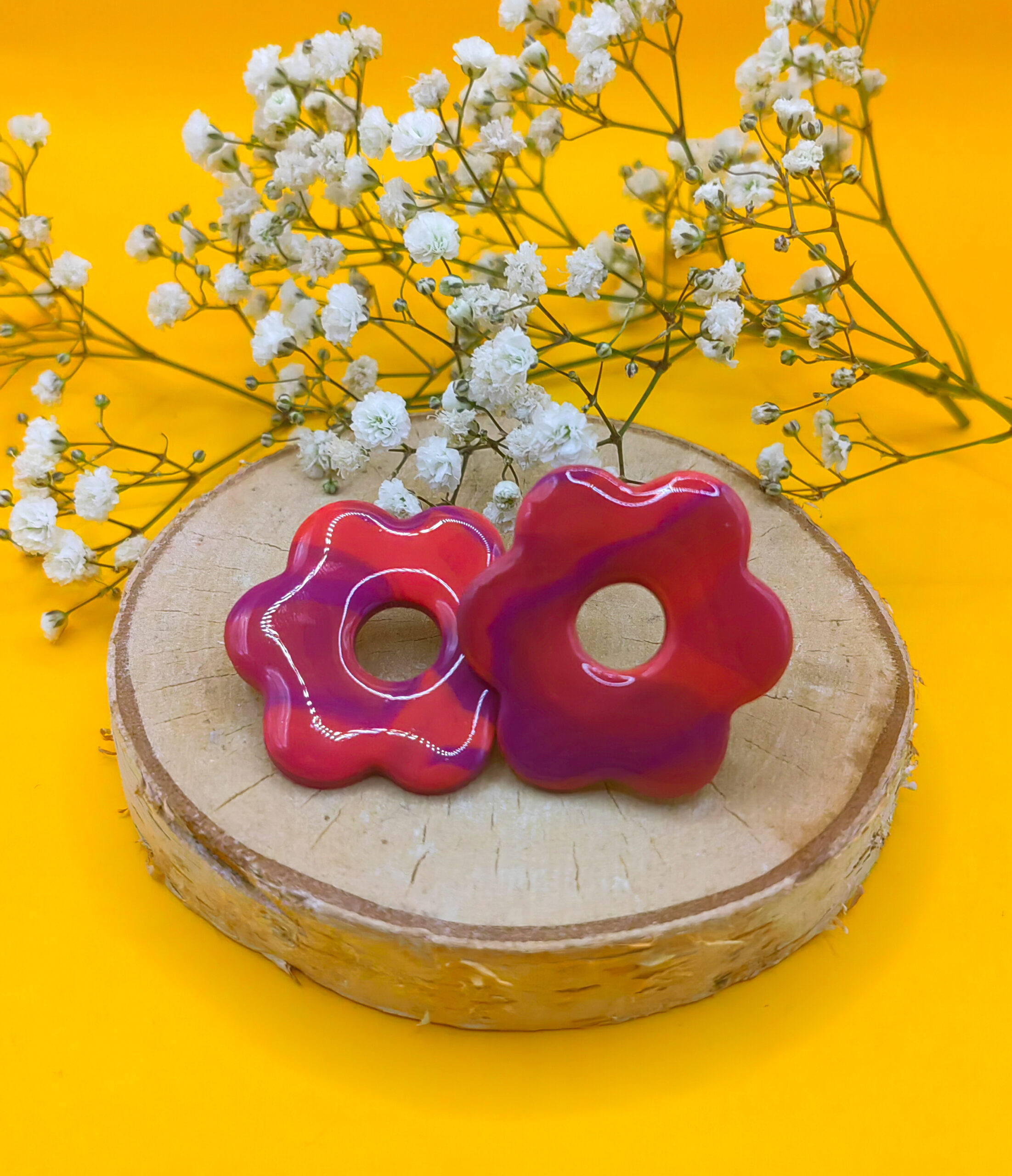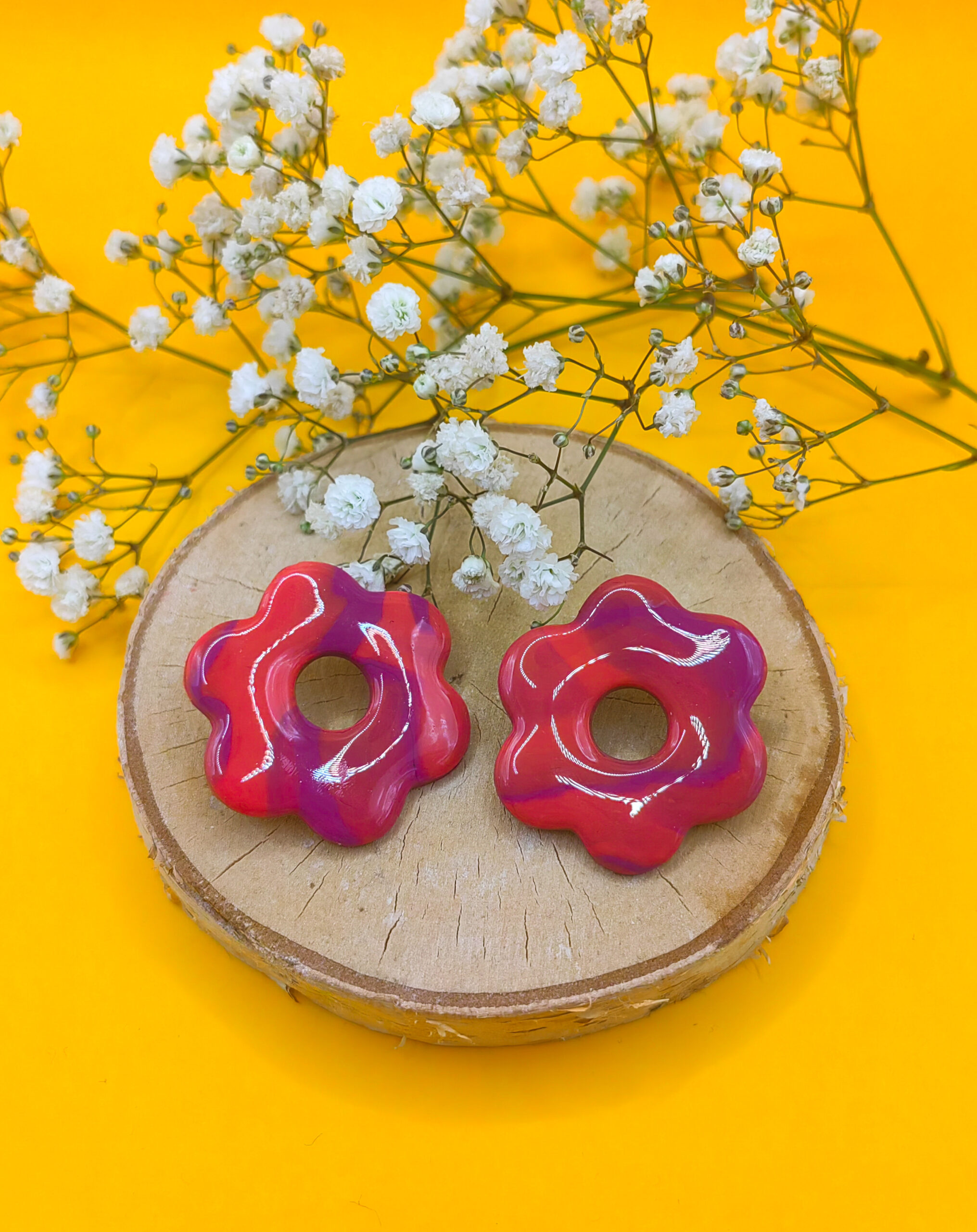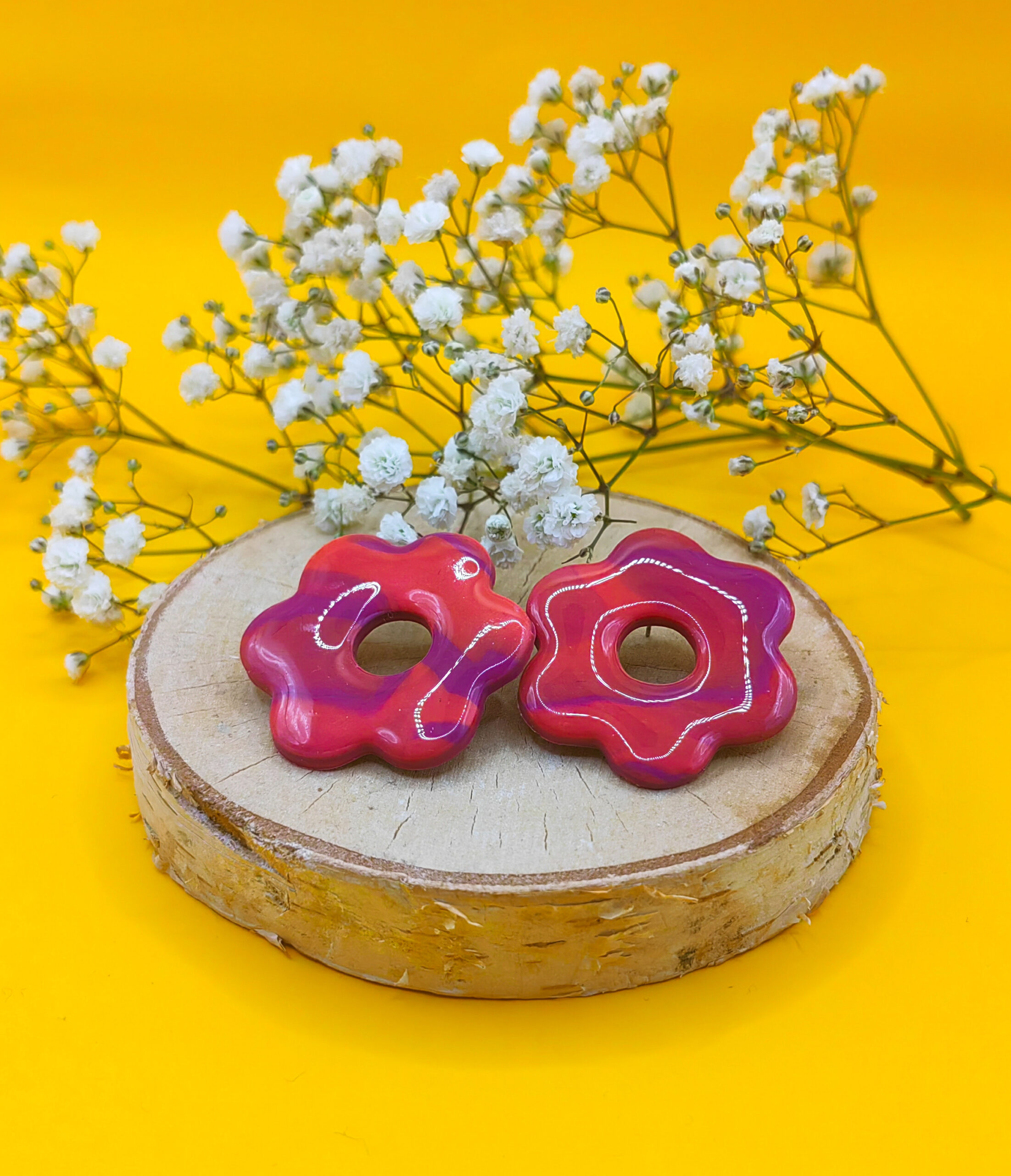 Wykonane z gliny polimerowej, kolczyki zachwycają intensywnymi odcieniami fioletu i czerwieni, które tworzą efektowną, ale subtelną harmonię. Kwiaty o średnicy około 4 cm przyciągają wzrok, stanowiąc wyrazisty akcent w każdej stylizacji – zarówno codziennej, jak i na specjalne okazje.