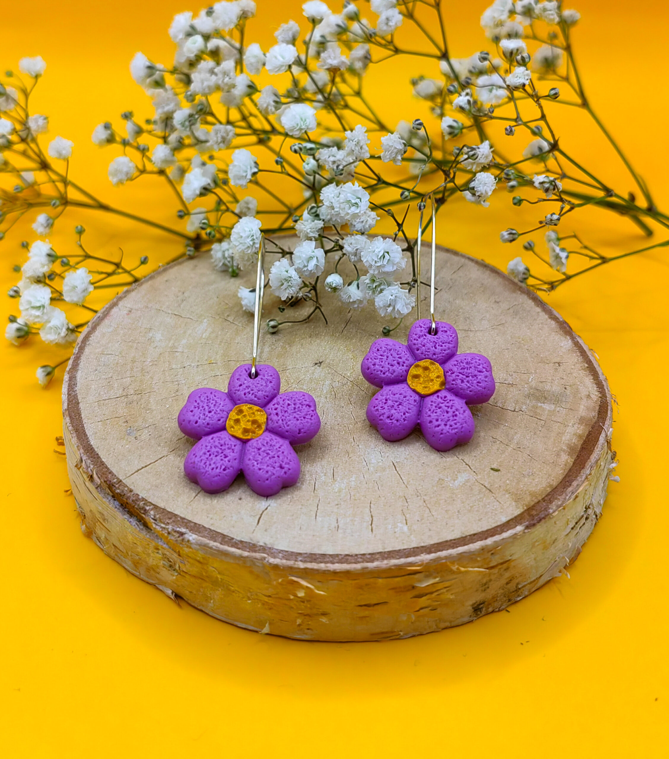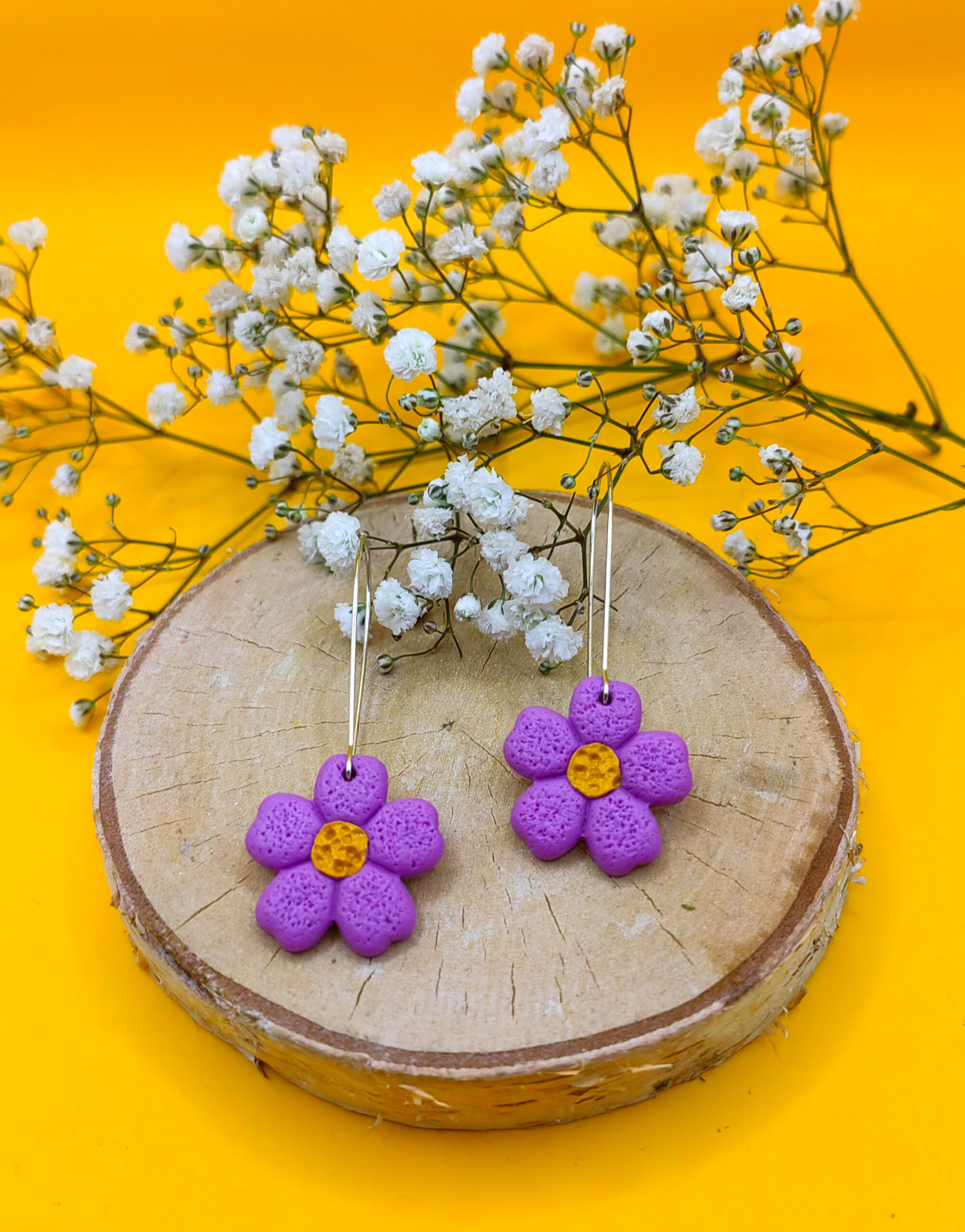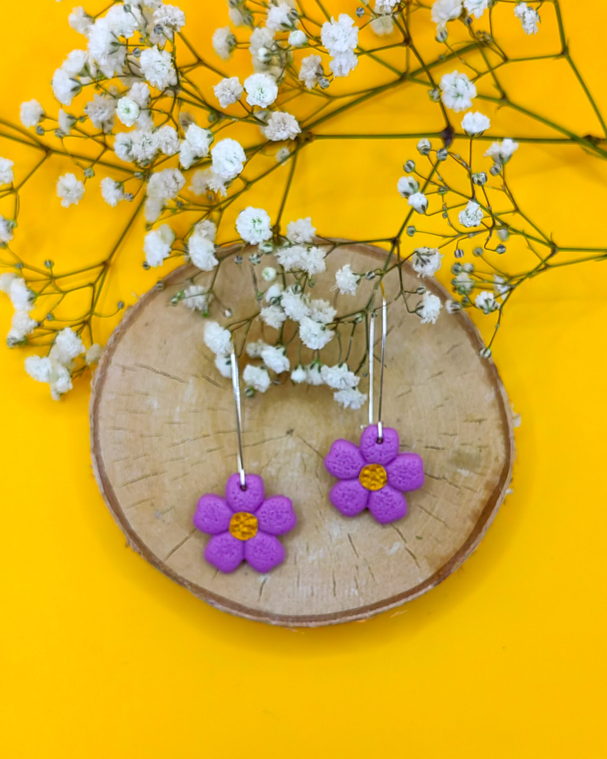 Wykonane z gliny polimerowej, mają kształt pięknego fioletowego kwiatu, którego serce zdobi intensywnie żółty środek. Kwiat o tak harmonijnych kolorach przyciąga wzrok, jednocześnie wprowadzając do stylizacji lekkość i świeżość.