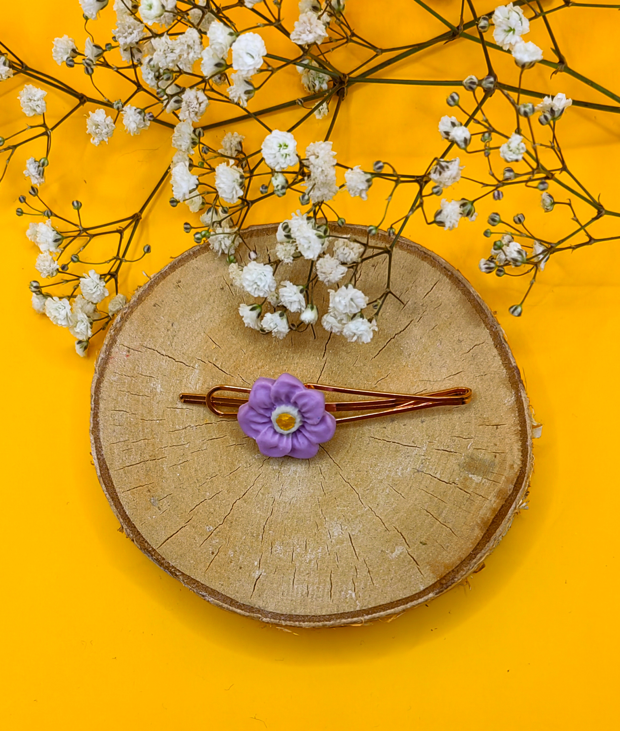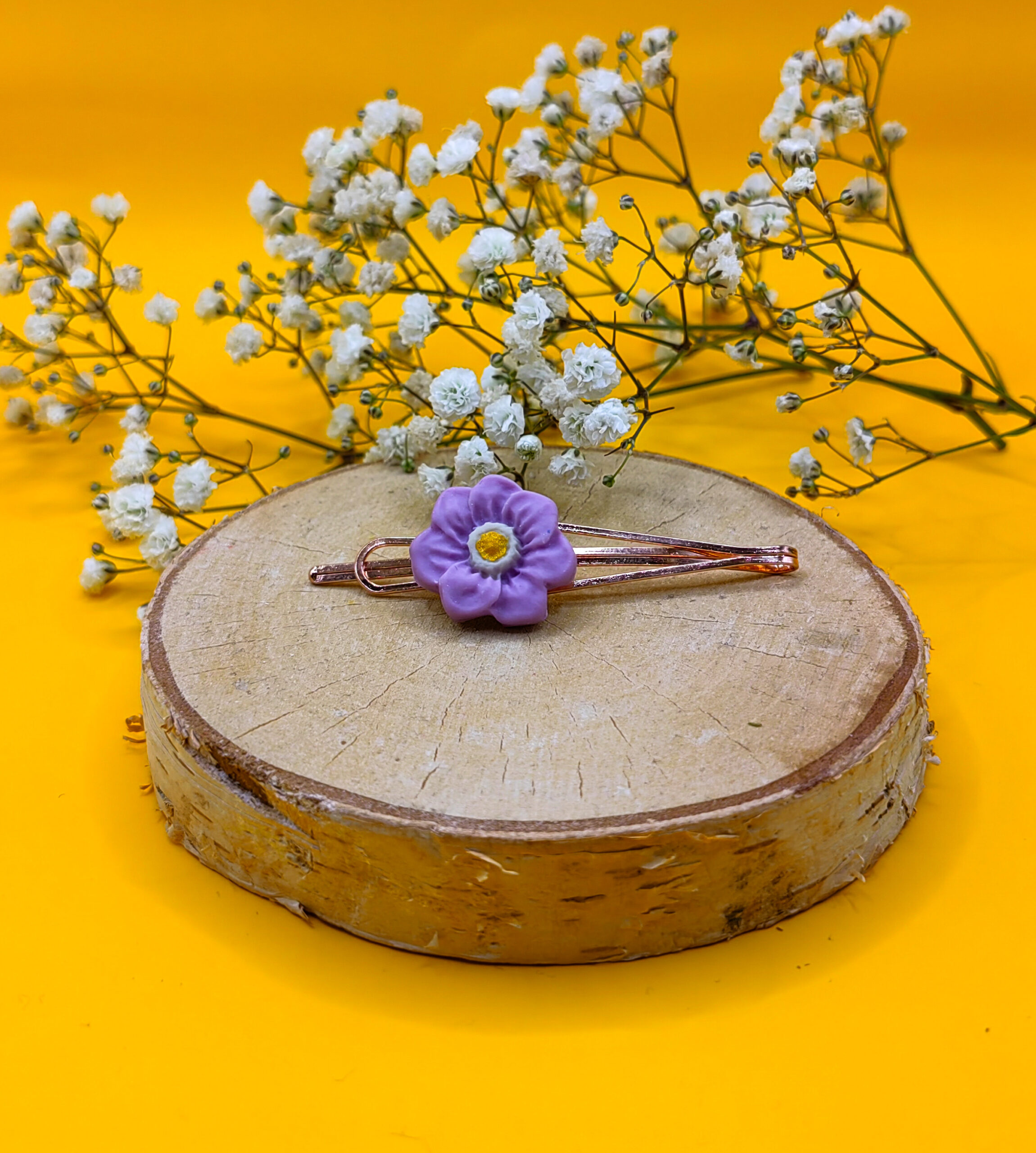 Ręcznie robiona spinka do włosów z lawendowym kwiatkiem z gliny polimerowej. Baza wykonana z wysokiej jakości stali chirurgicznej w kolorze rose gold. Całkowita długość spinki wynosi 7,5 cm. Idealny dodatek, który doda uroku każdej fryzurze.