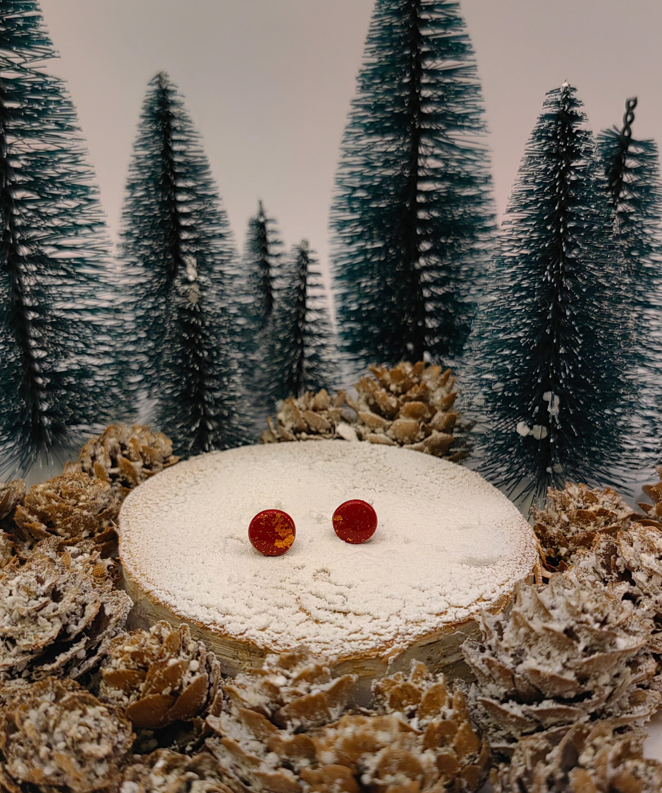 Minimalistyczne kolczyki w kształcie koła, wykonane ręcznie z gliny polimerowej w kolorze czerwieni z delikatnymi złotymi akcentami. Rozmiar około 1 cm, osadzone na sztyftach ze stali chirurgicznej, zapewniających komfort i trwałość. Idealne na co dzień, subtelny dodatek do każdej stylizacji.