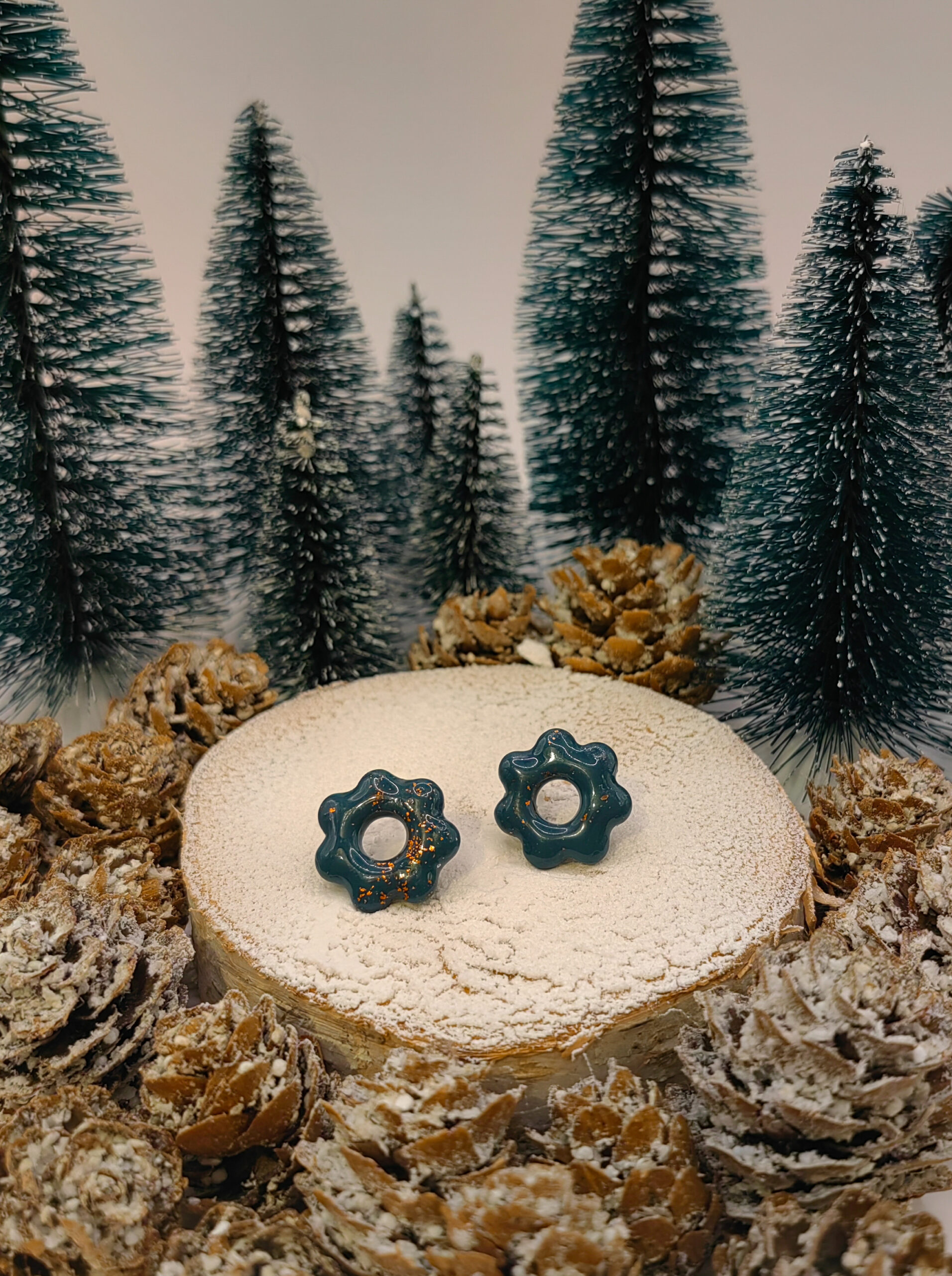 Eleganckie kolczyki w kształcie kwiatków, wykonane ręcznie z gliny polimerowej. Zielony kolor z delikatnymi złotymi akcentami nadaje im świątecznego blasku. Kolczyki osadzone na sztyftach ze stali chirurgicznej, co zapewnia komfort noszenia i trwałość. Idealny wybór na świąteczne okazje, dodający każdej stylizacji elegancji i wyjątkowego charakteru.